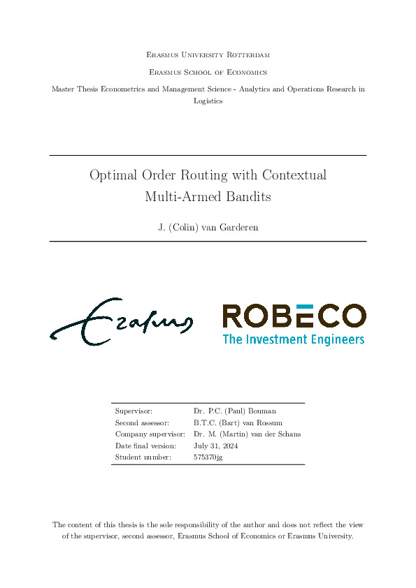 Garderen, J. van. (2024, August 27). Optimal Order Routing with Contextual Multi-Armed Bandits. Econometrie. Retrieved from http://hdl.handle.net/2105/72882 |